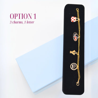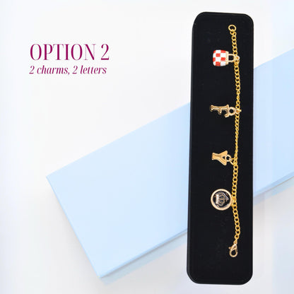 - 4 charms (combination of letters and themed charms, please specify in instructions upon checking out)